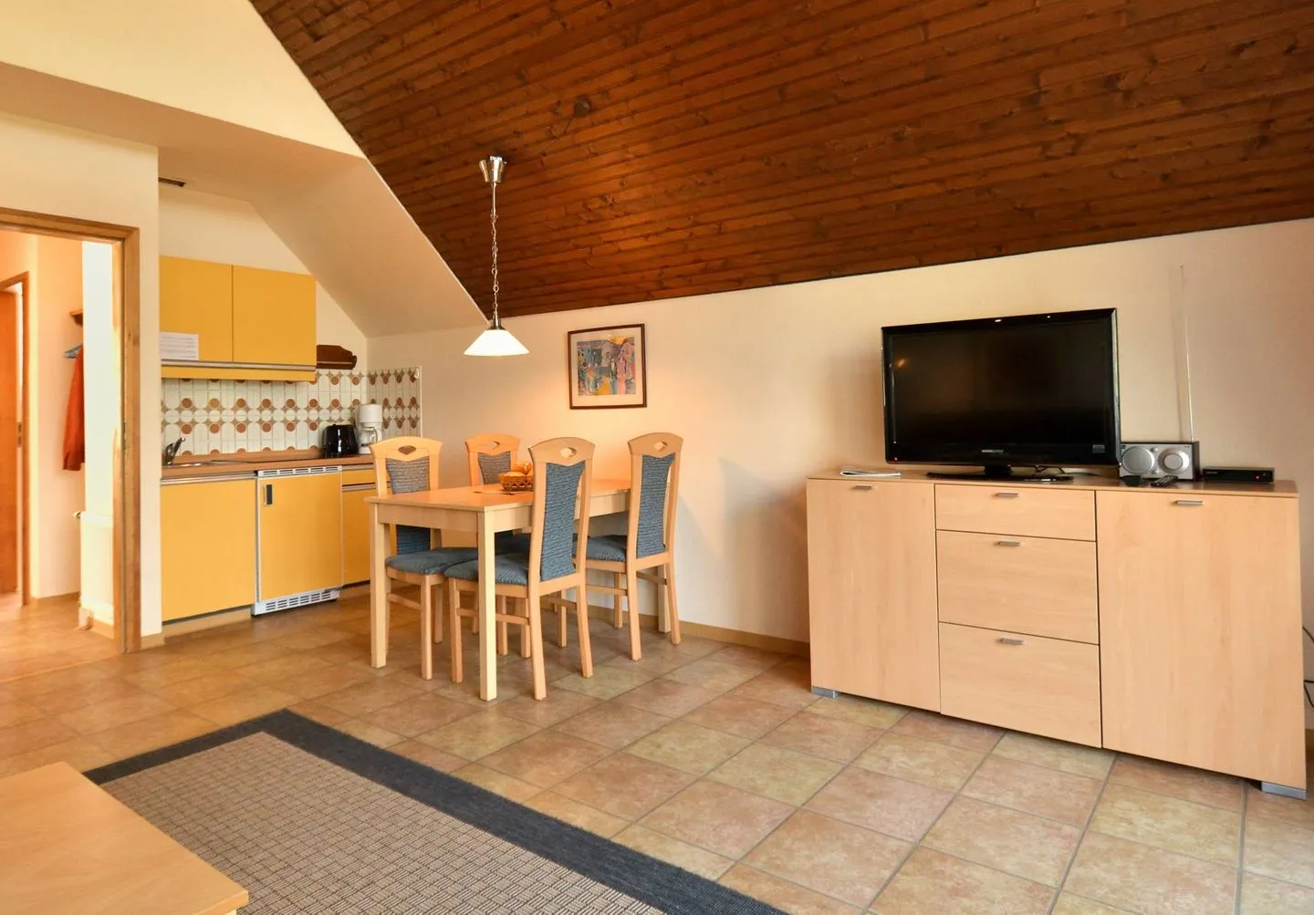 Im großen Wohnbereich sind eine kleine Essecke mit Platz für vier Personen und eine Pantryküche vorhanden. Die Küchenzeile mit 150 cm Breite ist vollständig ausgestattet. So sind neben Kühlschrank mit Gefrierfach, Elektroherd und Spüle auch Geräte, wie Kaffeemaschine, Toaster und Wasserkocher vorhanden. Selbstverständlich sind auch Geschirr, Besteck, Töpfe, Pfannen und weitere Küchenutensilien in ausreichender Anzahl vorhanden.