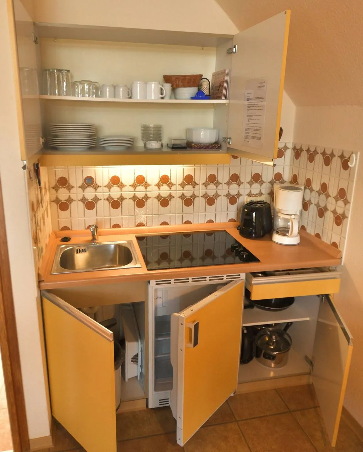 Im großen Wohnbereich sind eine kleine Essecke mit Platz für vier Personen und eine Pantryküche vorhanden. Die Küchenzeile mit 150 cm Breite ist vollständig ausgestattet. So sind neben Kühlschrank mit Gefrierfach, Elektroherd und Spüle auch Geräte, wie Kaffeemaschine, Toaster und Wasserkocher vorhanden. Selbstverständlich sind auch Geschirr, Besteck, Töpfe, Pfannen und weitere Küchenutensilien in ausreichender Anzahl vorhanden.