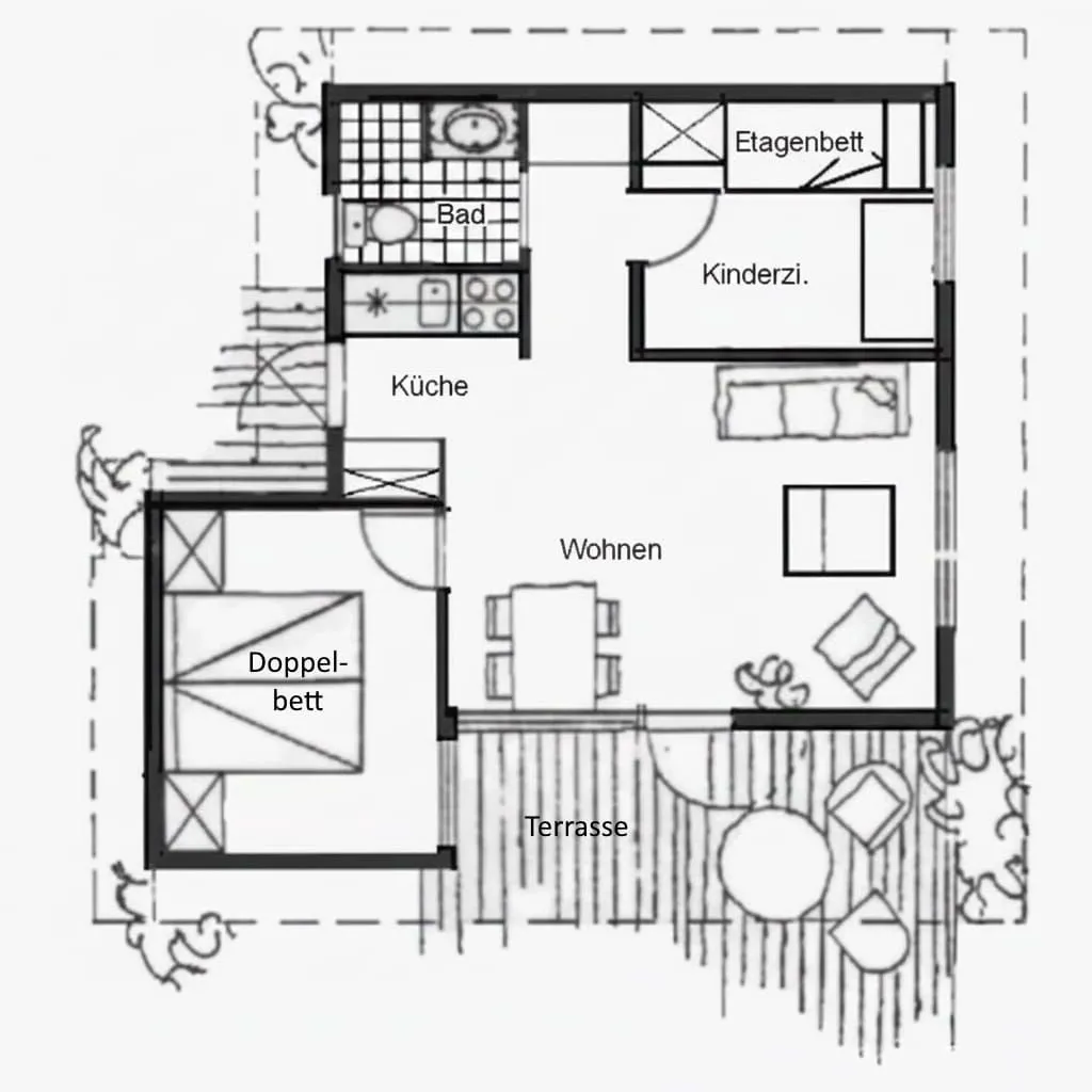 Über die Eingangsterrasse kommen Sie über die voll bestückte kleine Küche in den großen Wohnraum mit Essecke und gemütlichem Ecksofa samt SAT-TV. Die schöne Südterrasse mit Sitzgelegenheiten lädt zum entspannten Verweilen in der Natur ein. Die 50 m² Wohnfläche mit einem Schlafzimmer mit Doppelbett und einem weiteren Schlafzimmer mit Etagenbett bieten Platz für vier Personen und zusätzlich für bis zu zwei Kleinkinder bis 2 Jahren. Aus dem Wohnraum kommen Sie über einen kleinen Flur in das Bad mit Waschplatz, Dusche und WC. Außerdem gehört ein Pkw-Stellplatz selbstverständlich zu jedem Ferienhaus und Sie können den Internetzugang per WLAN kostenfrei nutzen.