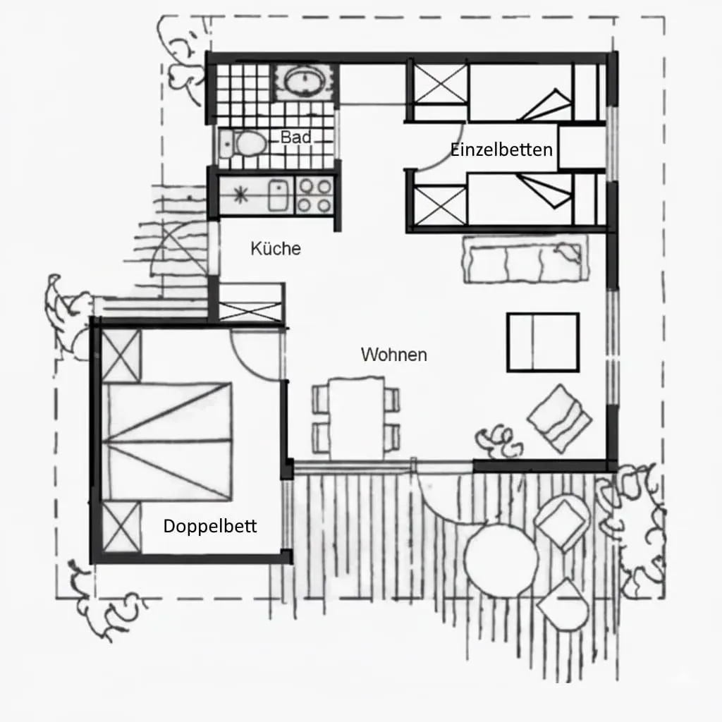 Über die Eingangsterrasse kommen Sie über die voll bestückte kleine Küche in den großen und lichtdurchfluteten Wohnraum mit Essecke und gemütlichem Ecksofa samt SAT-TV. Die schöne Südterrasse mit Sitzgelegenheiten lädt zum entspannten Verweilen in der Natur ein. Die 50 m² Wohnfläche mit einem Schlafzimmer mit Doppelbett und einem weiteren Schlafzimmer mit zwei Einzelbetten bieten Platz für vier Personen und zusätzlich für bis zu zwei Kleinkinder bis 2 Jahren. Aus dem Wohnraum mit großer Fensterfront kommen Sie über einen kleinen Flur in das Bad mit Waschplatz, Dusche und WC. Außerdem gehört ein Pkw-Stellplatz selbstverständlich zu jedem Ferienhaus und Sie können den Internetzugang per WLAN kostenfrei nutzen.