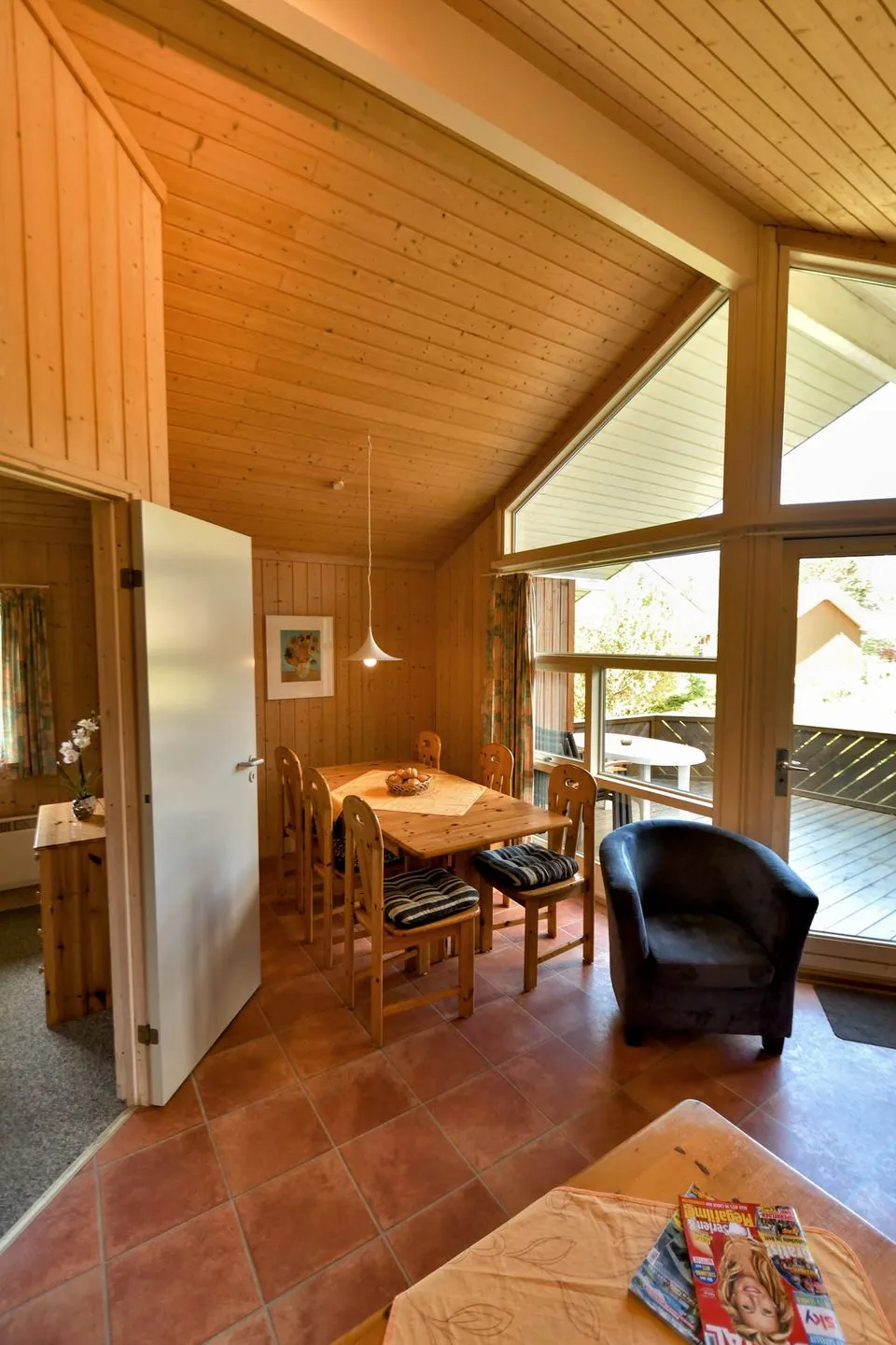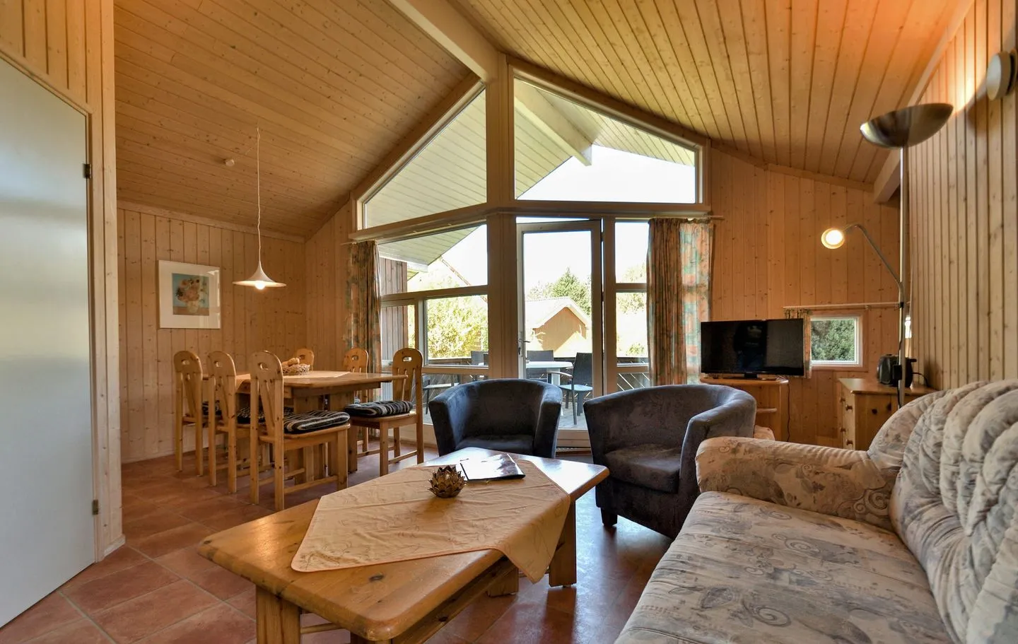 Ein gemütliches Ecksofa neben dem Alkovenbett mit SAT-TV und Radio sowie ein Essbereich mit sechs Sitzplätzen gehören zum großzügigen Wohnraum. Dieser geht direkt über den langen Flur mit Garderobe. Der ganze Bereich verfügt über einen hochwertigen Laminatboden und eine hohe Fensterfront zur großen Hauptterrasse. Internetzugang per WLAN ist im gesamten Ferienpark und in allen Unterkünften kostenfrei verfügbar.