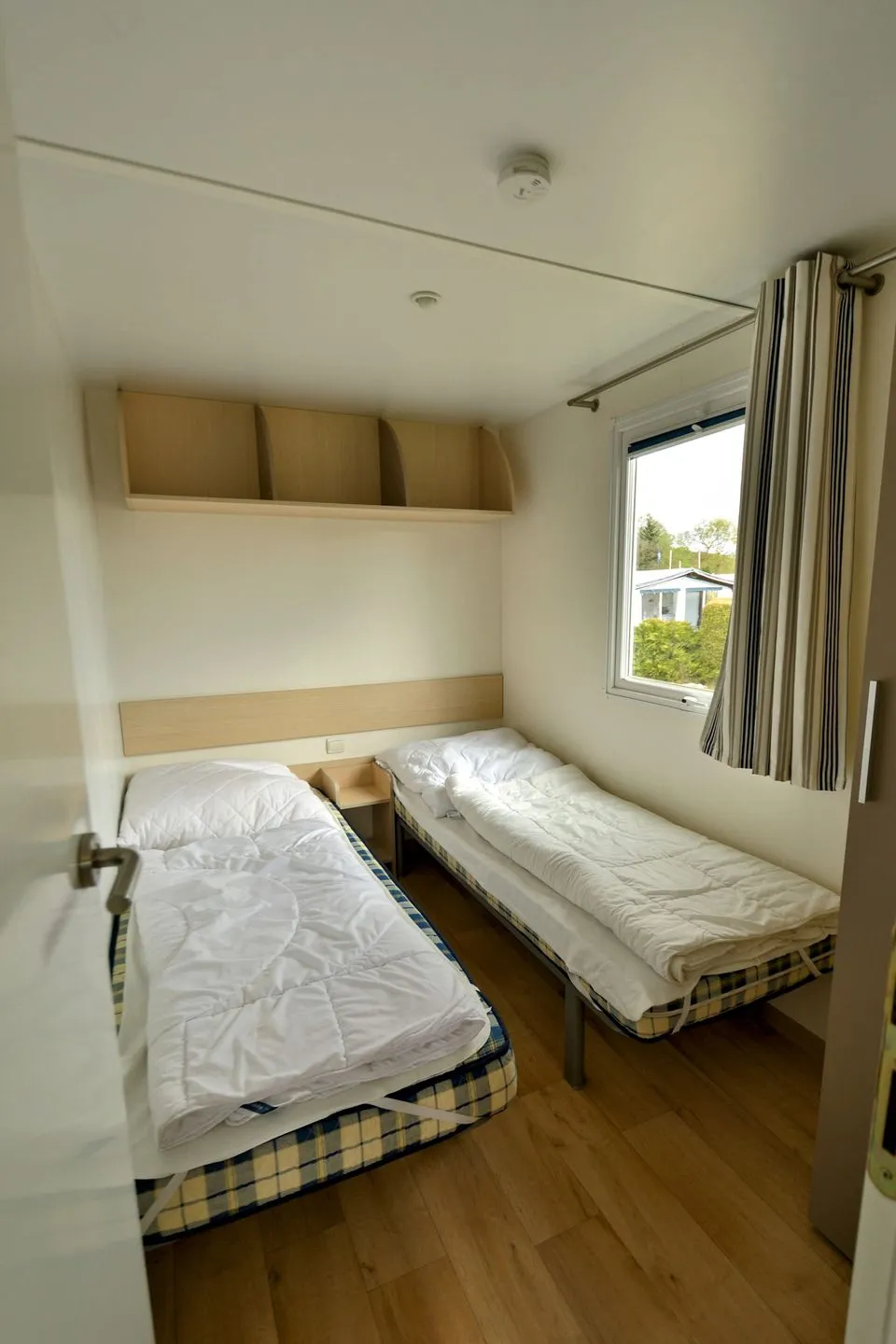 Das Mobilheim Méditerranée verfügt über zwei Schlafzimmer. Ein Zimmer mit Doppelbett (160 × 200 cm) und ein weiteres mit zwei Einzelbetten (70/80 × 190 cm). Es sind Ablagen, Fächer und Schränke zum Verstauen von persönlichen Dingen vorhanden. In beiden Räumen lassen sich Fenster öffnen und durch Vorhänge und Plissees verdunkeln.