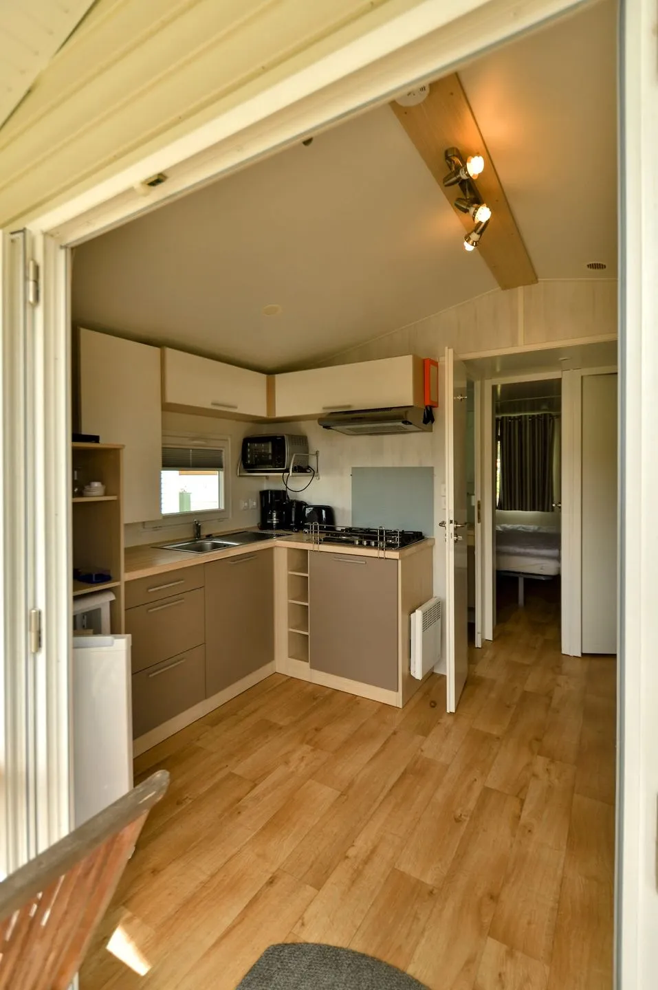 Eine Sitzecke samt Tisch mit zwei Stühlen und SAT-TV mit Radio gehören zum gemütlichen Wohnraum. Die kleine Küchenzeile befindet sich ebenfalls im Wohnraum. Die zweiflügelige Eingangstür und die Fensterfront zur Terrasse können durch Vorhänge verdunkelt werden. Internetzugang per WLAN ist im gesamten Ferienpark und in allen Unterkünften kostenfrei verfügbar.